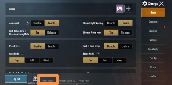 في أول خيارات الاعدادات وهو basic قم بالضغط على زر delete account. في قسم lobby ي مكنك رؤية أيقونة على شكل ت رسع وهي خاصة بالإعدادات.